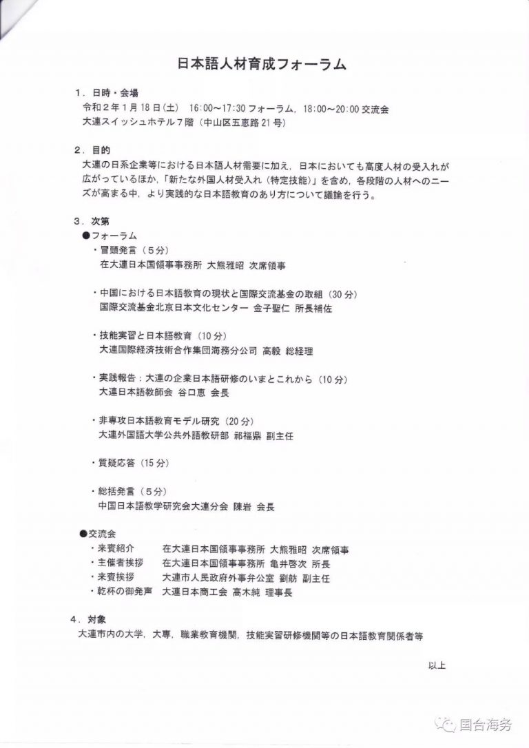 我司總經(jīng)理高毅參加日語人才培養(yǎng)論壇 2020-09-04 1797 2020年1月18日,我司總經(jīng)理高毅參加了大連日本領(lǐng)事辦公室及中國日語教學(xué)研究會(huì)大連分會(huì)主辦的“日語人才培養(yǎng)論壇”,并作為技能實(shí)習(xí)生派遣機(jī)關(guān)代表以“技能實(shí)習(xí)與日語教育”為主題進(jìn)行了演講